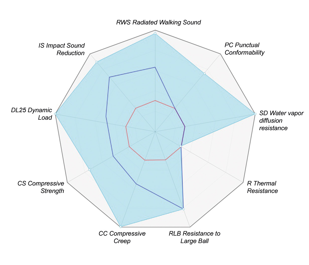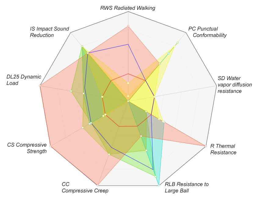 In the network diagram, the technical data of the products is displayed graphically along the 9 axes. Each axis starts in the centre and ends at the outer ring, i.e. the better a product, the larger the area in this range. If no data is available from the manufacturer, these criteria are not evaluated.