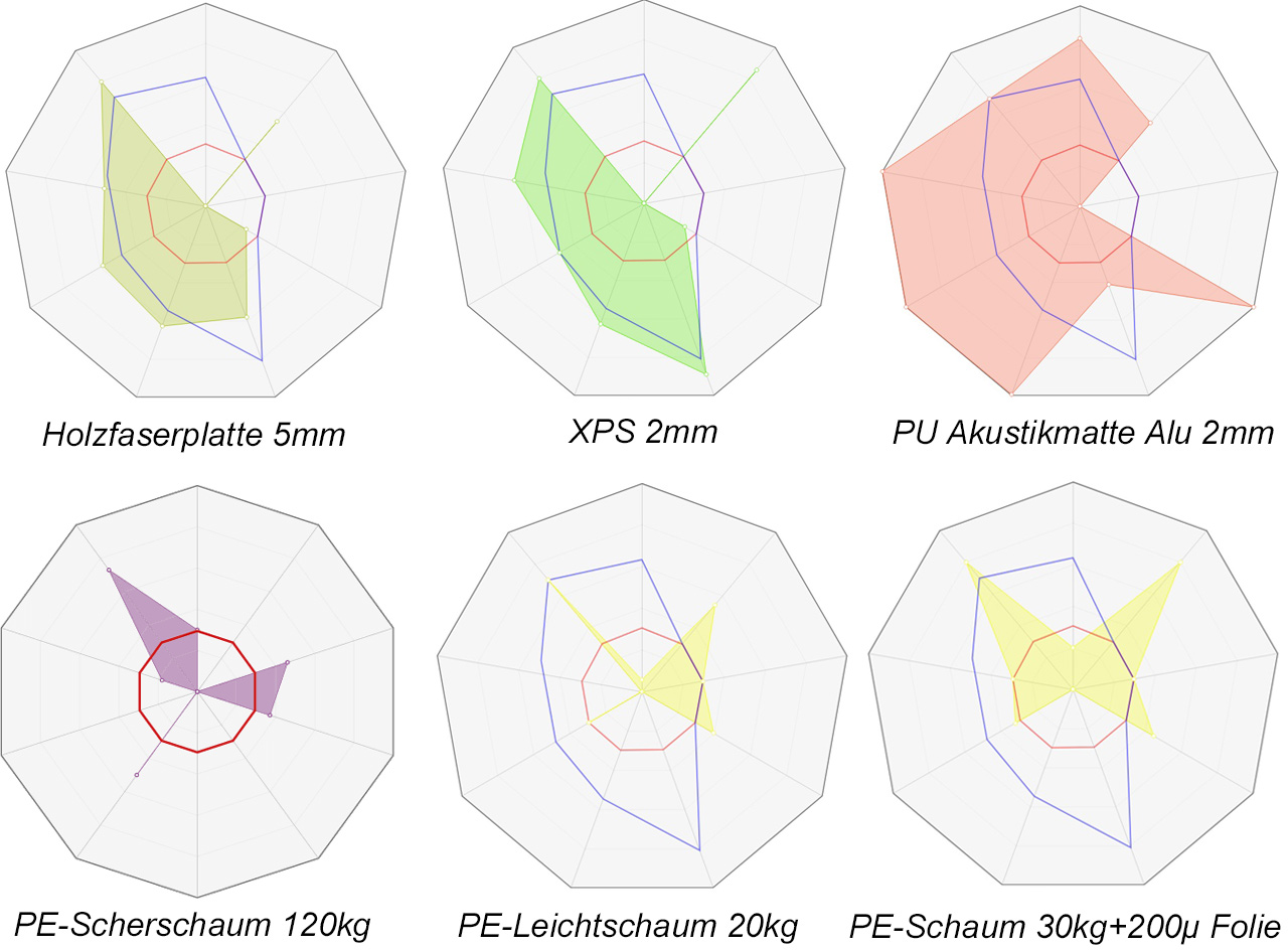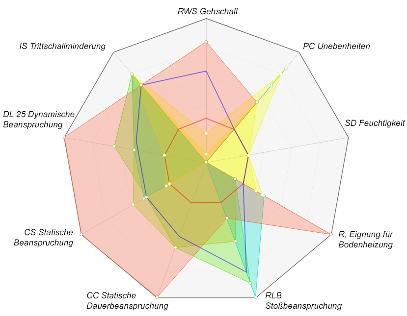 Im Netzdiagramm werden die technischen Daten der Produkte entlang der 10 Achsen grafisch dargestellt. Jede Achse beginnt in der Mitte und endet am äußeren Ring, d. h. je besser ein Produkt, desto größer die Fläche in diesem Bereich. Liegen herstellerseits keine Daten vor, werden diese Kriterien nicht bewertet.