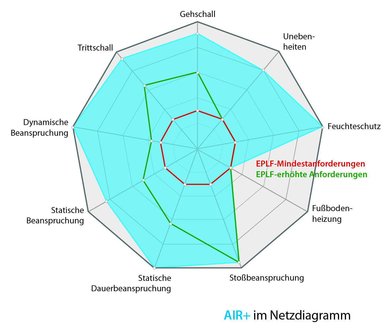 Durch die viskoelastischen Eigenschaften in Verbindung mit einer erhöhten Formstabilität erreichen unsere Schäume in nahezu allen Bereichen Spitzenwerte. Das macht sie zu multifunktionalen Alleskönnern wie man am Beispiel AIR+ im Netzdiagramm sehen kann. AIR+ übertrifft alle erhöhten Anforderungen des EPLF und setzt Maßstäbe bei Tritt- und Gehschalldämmung. Das ist einzigartig.
